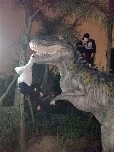 在周先生提供的照片里记者看到,一位身穿黑色上衣、约10多岁的男孩,一只脚踩在恐龙的前爪上,双手紧紧的抓住恐龙的嘴时不时的往上攀爬。见他攀爬,另一个10多岁的小孩也加入了攀爬的队伍中。
